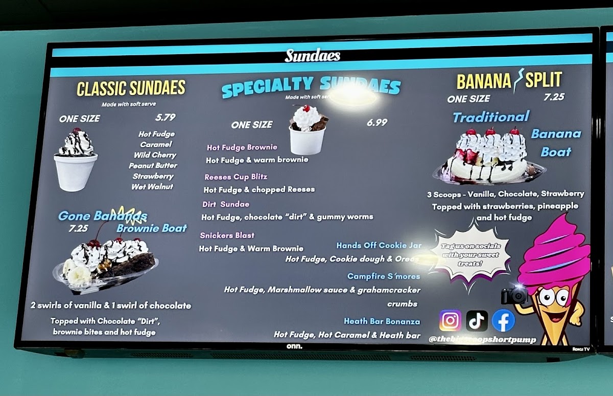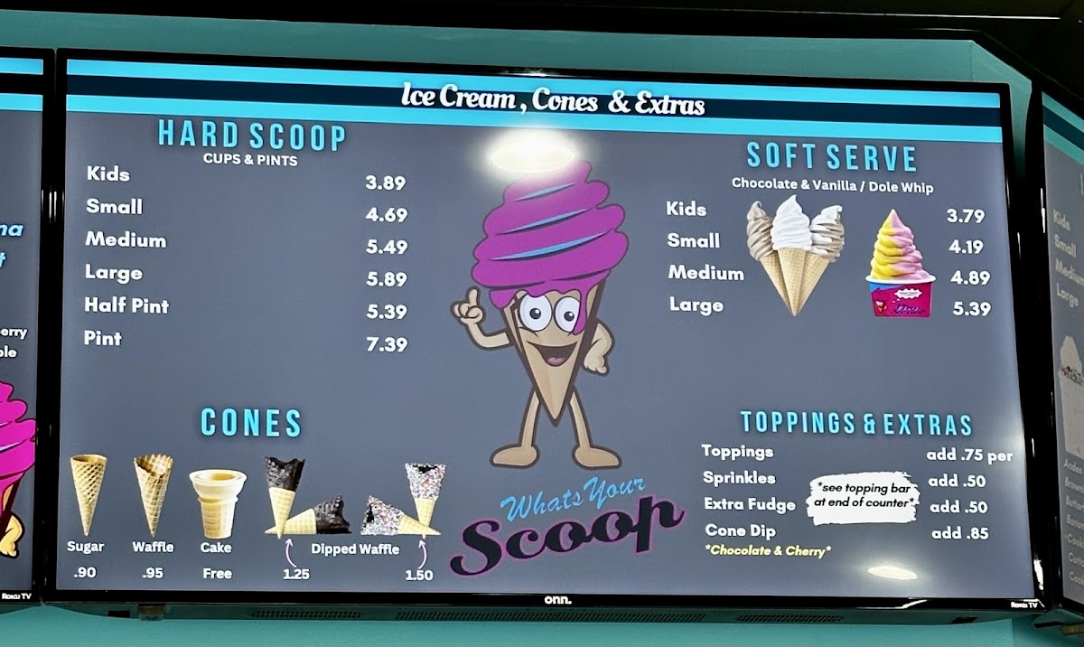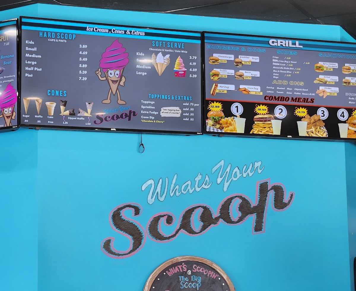 The menu at The Big Scoop offers a delightful array of indulgent treats and comforting eats, perfect for any craving. Their Specialty Sundaes include tempting options like the Gone Bananas Brownie Boat and Hands Off-Cookie Jar, with prices that make them a satisfying choice. The Hot Fudge Brownie and Reese's Cup Blitz Dirt Sundae are standout sundaes for those with a sweet tooth. For a cold treat, the Hard Serve section boasts flavors such as Coffee Cookies & Cream, Moose Tracks, and the refreshing Mint Moose Track. If you’re in the mood for something warm, try the Funnel Cake options, including the Strawberry Short Cake and Oreo Cookie Blast. The savory offerings are just as enticing, with items like the #3 Chicken Tender Combo featuring crispy tenders, fries, and a drink, or the Cheeseburger choices like the Breakfast Burger and Bacon Burger. Don't miss out on their Fried Oreo Madness or the classic Fried Oreos for a fun dessert. The drink menu includes a variety of Floats like the Dr Pepper Float and Coke Float, and milkshakes in flavors such as Vanilla and Peanut Butter. For those looking for a light bite, there are tasty options like the Grilled Cheese and BLT Sandwich, alongside delicious Chicken Sandwich combos. If you want something crispy, the Fried Food Cravings menu features Mozzarella Sticks and Sweet Potato Waffle Fries. The Dole Whip section includes dairy-free options like Mango Dole Whip and Lime Dole Whip, perfect for a refreshing treat. Whether you’re looking for a savory snack or a sweet indulgence, The Big Scoop offers something for everyone!