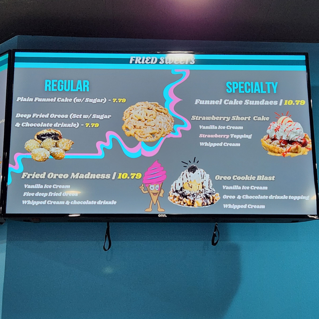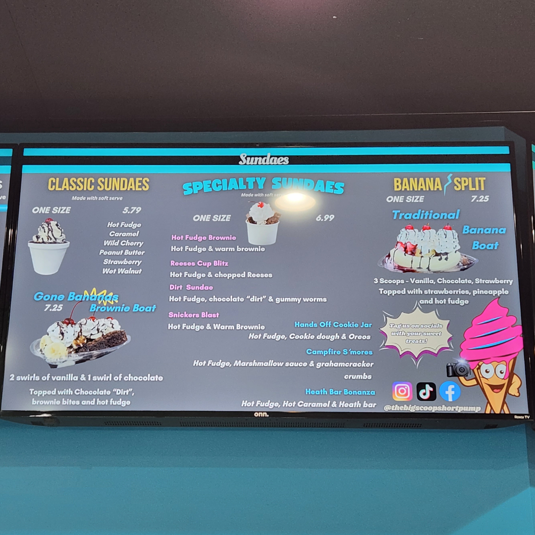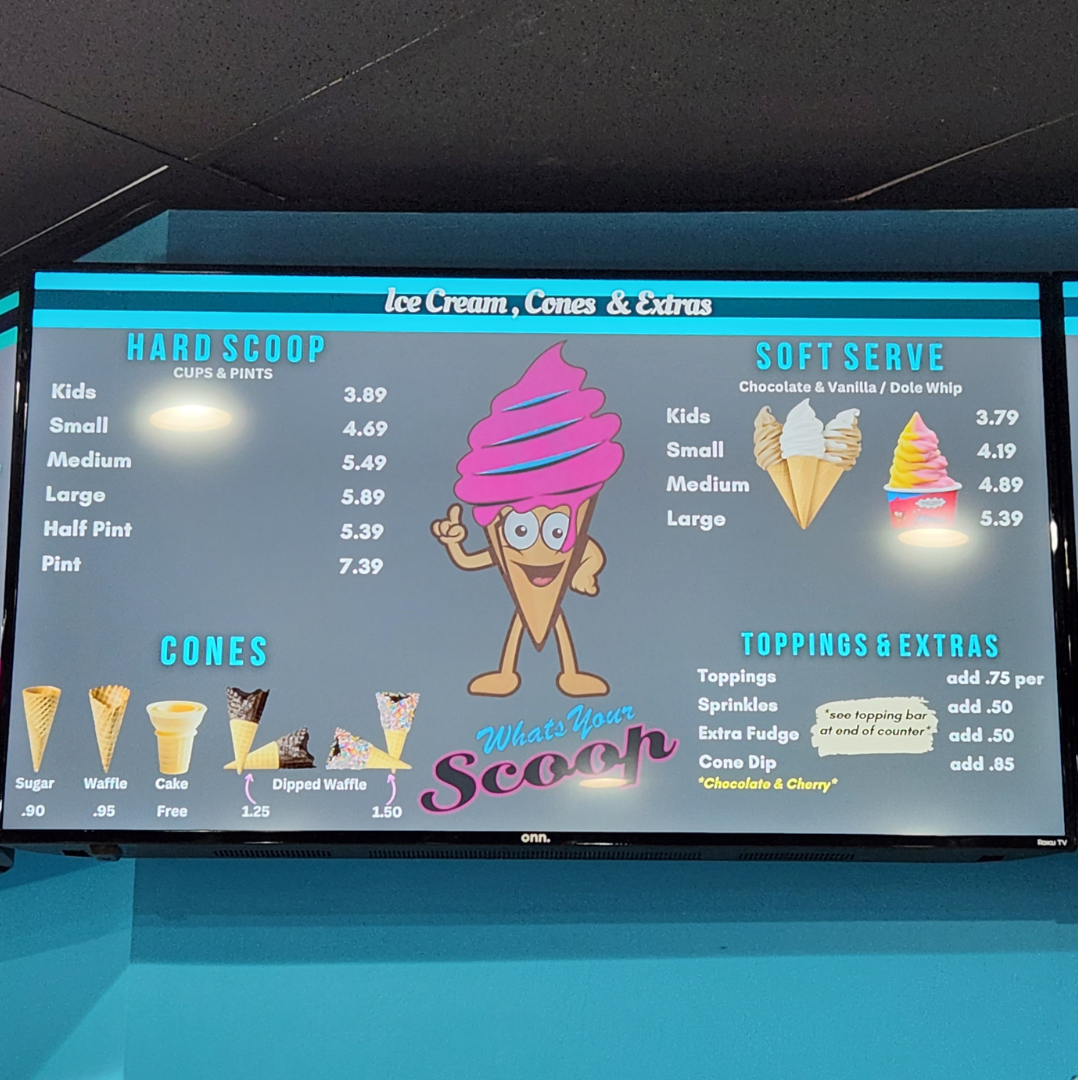 The menu at The Big Scoop offers a delightful array of indulgent treats and comforting eats, perfect for any craving. Their Specialty Sundaes include tempting options like the Gone Bananas Brownie Boat and Hands Off-Cookie Jar, with prices that make them a satisfying choice. The Hot Fudge Brownie and Reese's Cup Blitz Dirt Sundae are standout sundaes for those with a sweet tooth. For a cold treat, the Hard Serve section boasts flavors such as Coffee Cookies & Cream, Moose Tracks, and the refreshing Mint Moose Track. If you’re in the mood for something warm, try the Funnel Cake options, including the Strawberry Short Cake and Oreo Cookie Blast. The savory offerings are just as enticing, with items like the #3 Chicken Tender Combo featuring crispy tenders, fries, and a drink, or the Cheeseburger choices like the Breakfast Burger and Bacon Burger. Don't miss out on their Fried Oreo Madness or the classic Fried Oreos for a fun dessert. The drink menu includes a variety of Floats like the Dr Pepper Float and Coke Float, and milkshakes in flavors such as Vanilla and Peanut Butter. For those looking for a light bite, there are tasty options like the Grilled Cheese and BLT Sandwich, alongside delicious Chicken Sandwich combos. If you want something crispy, the Fried Food Cravings menu features Mozzarella Sticks and Sweet Potato Waffle Fries. The Dole Whip section includes dairy-free options like Mango Dole Whip and Lime Dole Whip, perfect for a refreshing treat. Whether you’re looking for a savory snack or a sweet indulgence, The Big Scoop offers something for everyone!